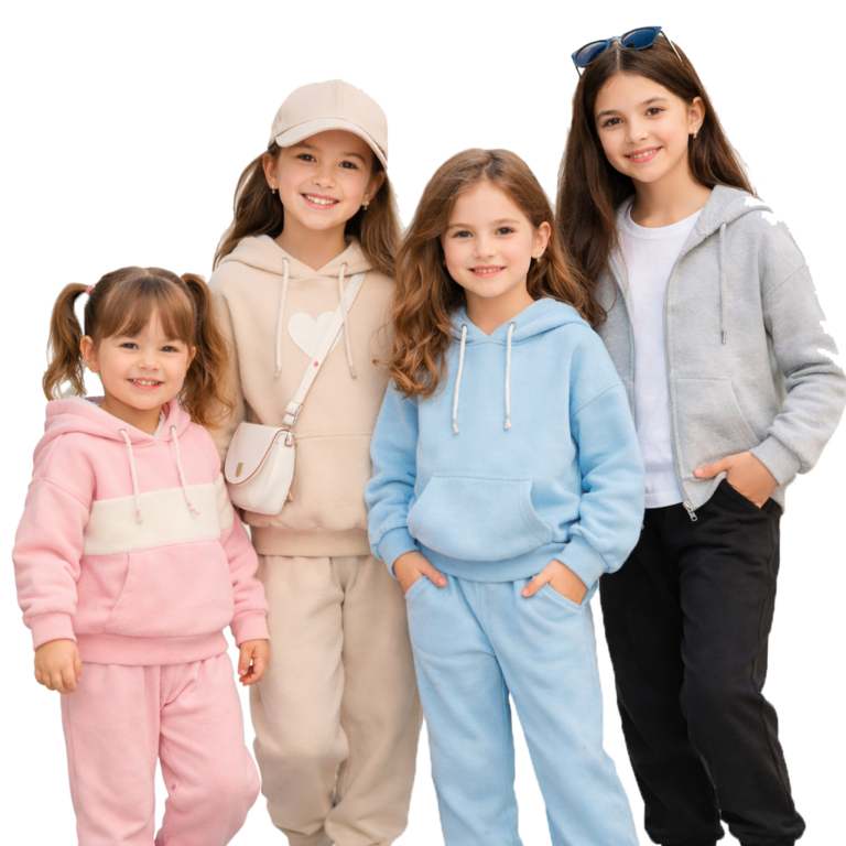 الطقم مكوّن من سويت شيرت بقبعة وبنطلون مريح، مناسب للمدرسة والخروج ويوفّر حرية حركة كاملة للأطفال.