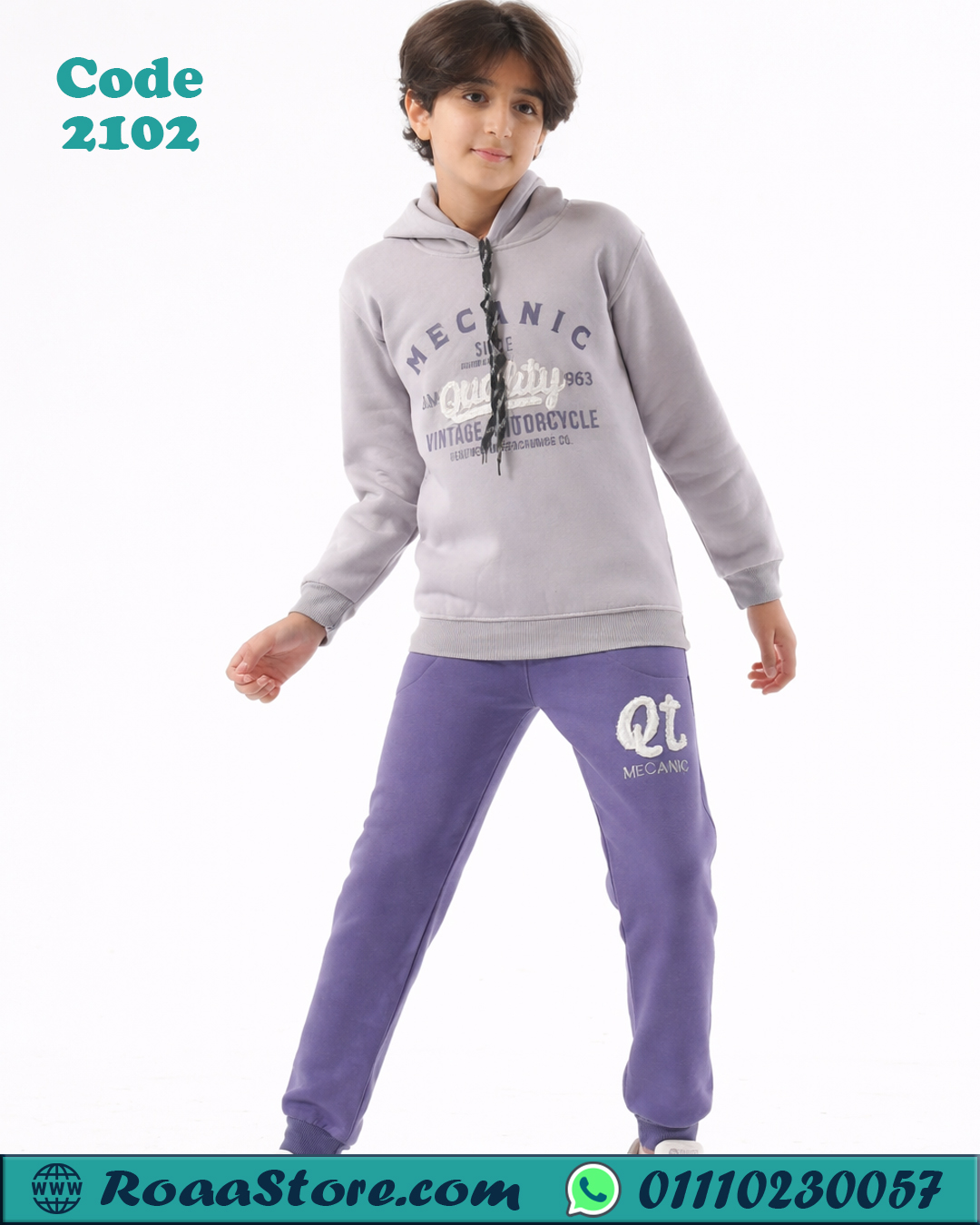 الطقم مكوّن من سويت شيرت بقبعة وبنطلون مريح، مناسب للمدرسة والخروج ويوفّر حرية حركة كاملة للأطفال.